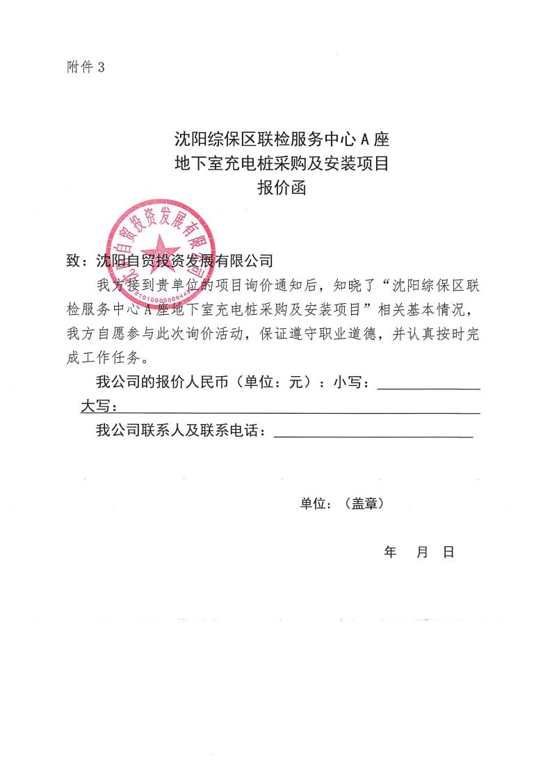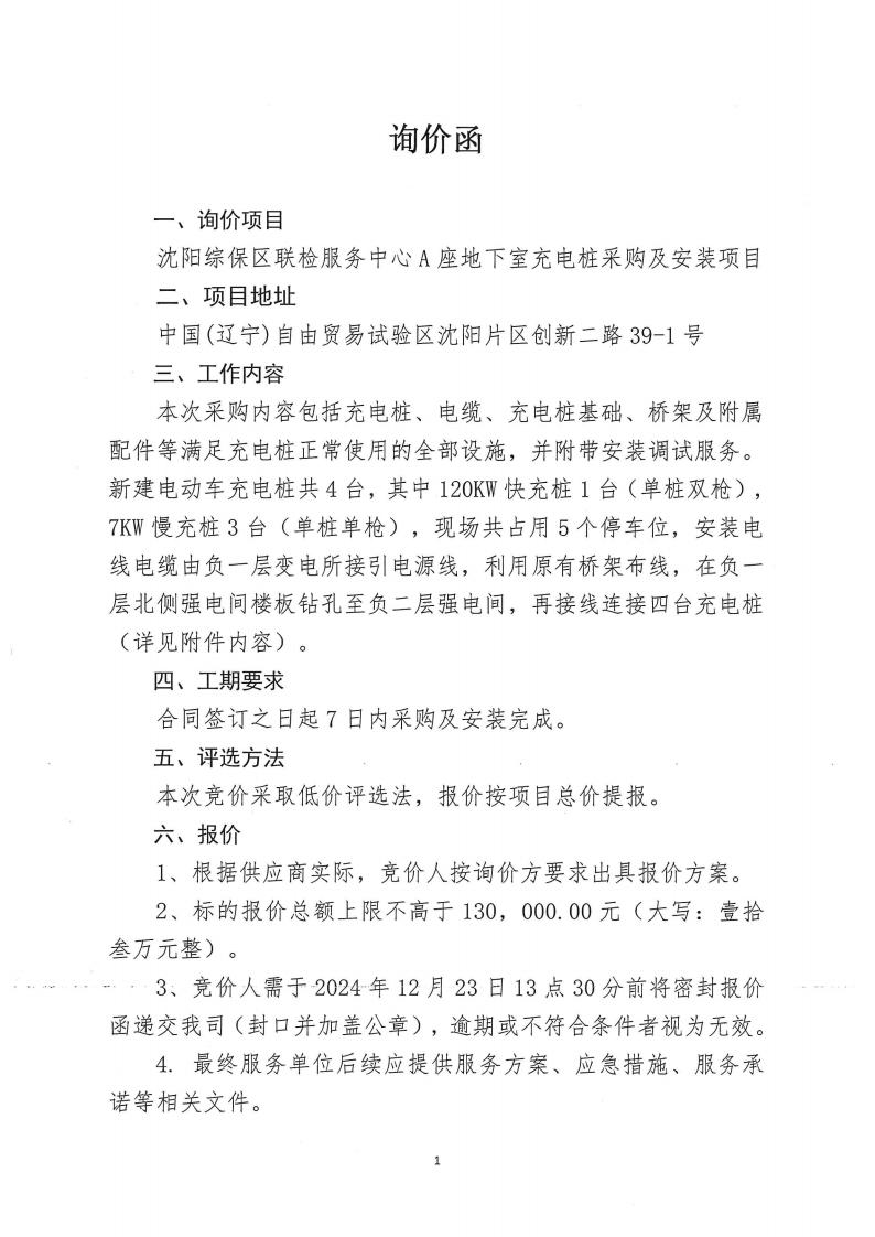 沈阳综保区联检服务中心A座地下室充电桩采购及安装询价项目
